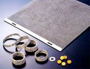 メリヤス編 0.2mm前後の細い線を、メリヤス状に編んだ金網で何枚も重ね合わせて、エアーフィルター等に使用されます。プレス加工品は振動吸収緩衝材としても使用されます。
